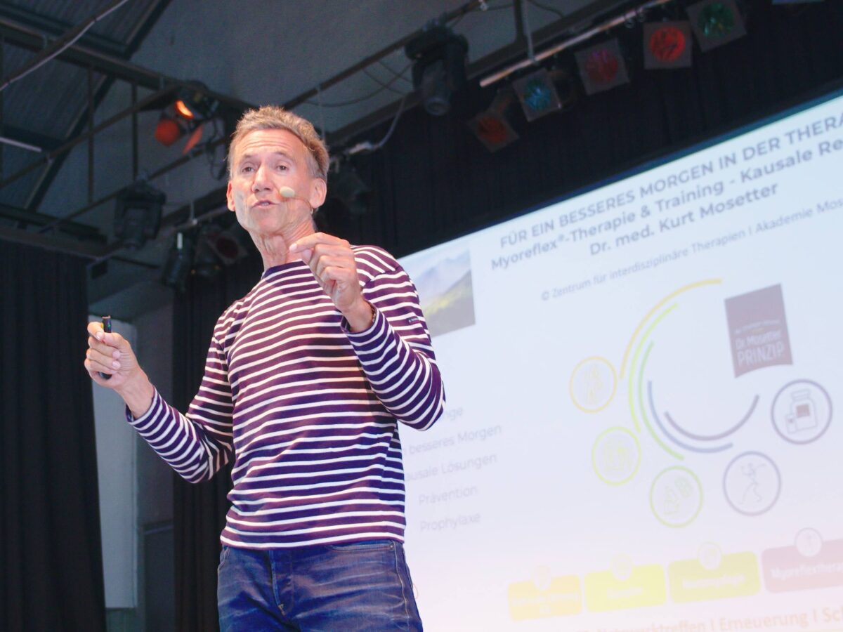 Ein Highlight des Rahmenprogramms war der Vortrag von Dr. med. Kurt Mosetter zum Thema „Für ein besseres Morgen in der Therapie“. Dabei stellte er die Myoreflex®-Therapie und das zugehörige Training als ursächliche und ganzheitliche Regulationsmethode vor.