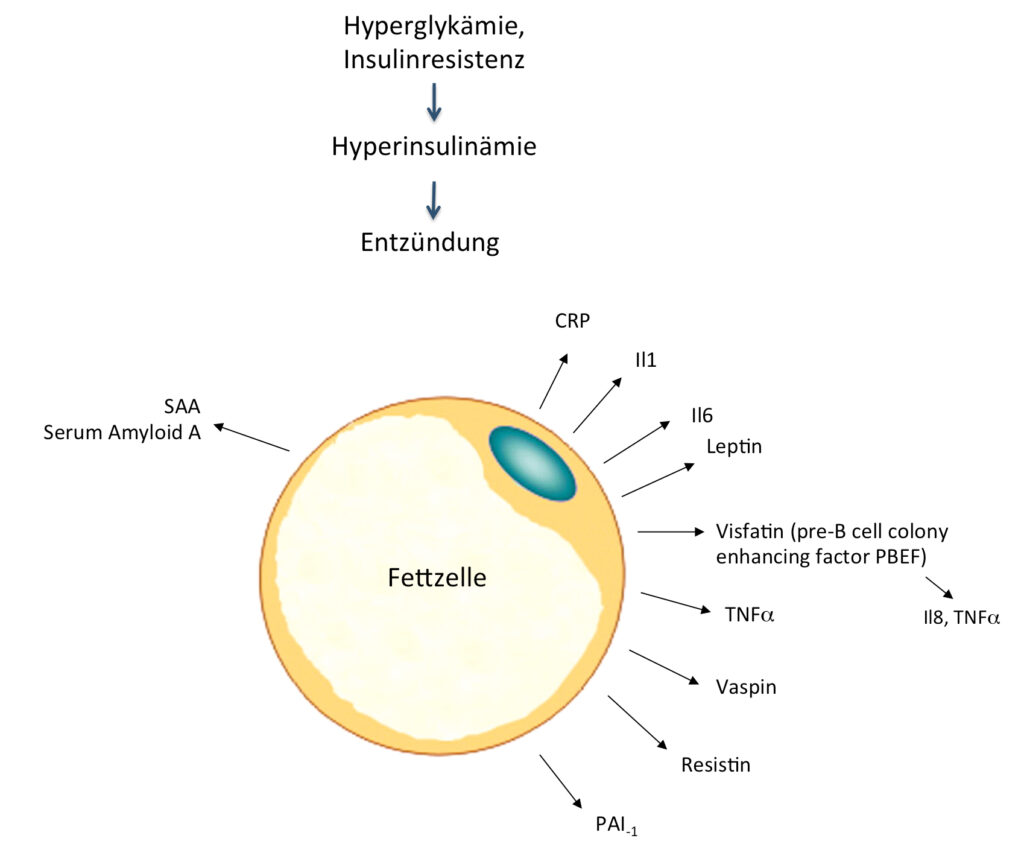 Mit steigendem Übergewicht entsteht das Krankheitsbild Fettleibigkeit (lat. Adipositas). Aus der Überfrachtung und Überfütterung des Organismus mit Zucker und kurzkettigen Kohenhydraten (Brot, Nudeln, Kartoffeln, Süßgetränke etc.) entsteht durch Belastungen des Leberstoffwechsels toxisches Fettgewebe. Die einzelnen Fettzellen werden unter diesen Umständen zu gefährlichen Hormondrüsen. Eine Serie von Entzündungsfaktoren, Hormone, welche im Überschuss zum Verlust des Sättigungsgefühls führen (Leptin), und viel zu hohe Wirkspiegel von Insulin und insulinähnlichen Wirkungsfaktor sind Ausgangspunkt praktisch aller Zivilisationskrankheiten.