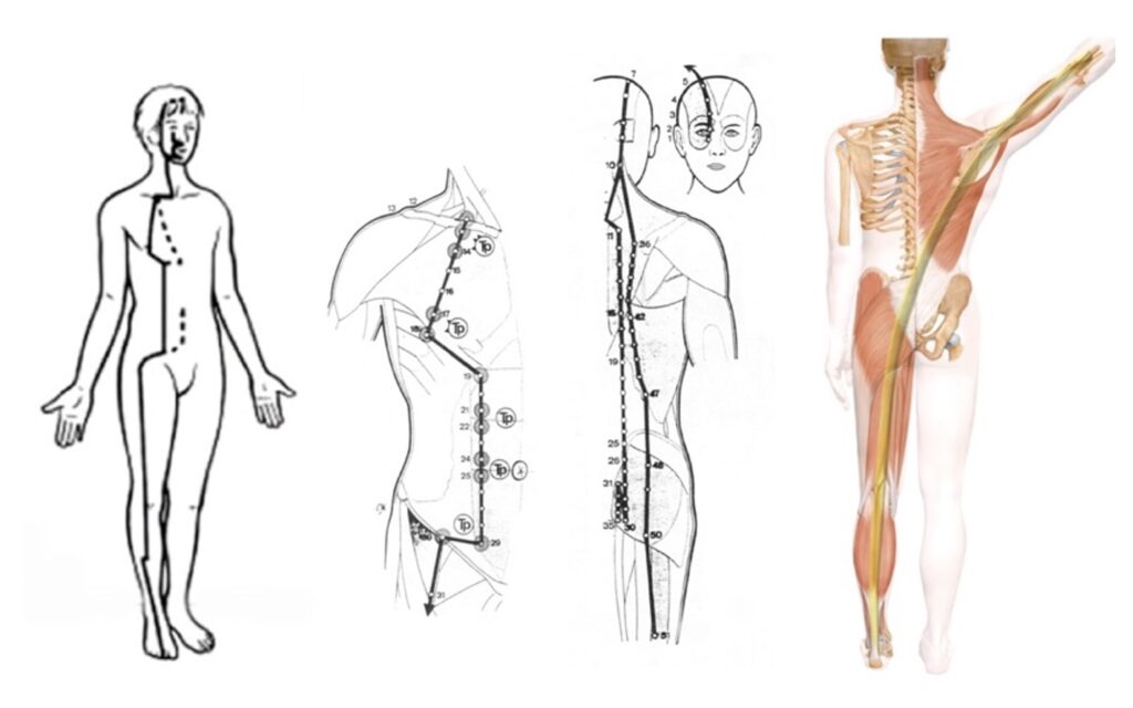 Ein klassisches Meridianbild, ein vorderer und ein hinterer Muskelmeridian (nach Bergsmann) sowie die Linie einer biokinematsichen, myofaszialen Kraftwirkung