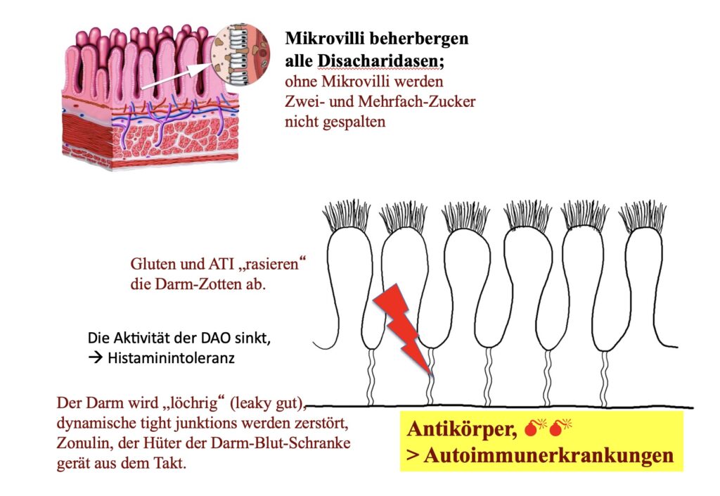 Wenn geschädigte Zotten und Microvilli in zu viel unverdauten Zuckern, Getreide und Milch „karamellisieren“ und „aufkochen“, sinken die Aktivitäten des Histamin abbauenden Enzyms, der DAO, in den Keller.