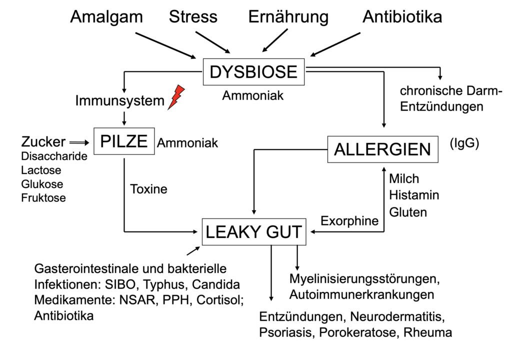 Aus dem Problem des löchrigen Darms folgen logische Immunreaktionen gegen unverdaute Bestandteile des gärenden Darms mit Antikörpern, welche dann sekundär in der Bronchialschleimhaut oder eben in der Haut einschlagen. Neurodermatitis, Ödeme, Schuppenflechte, Pseudoallergische Reaktionen, Akne und Porokeratose stellen bio-logische Folgen dar.