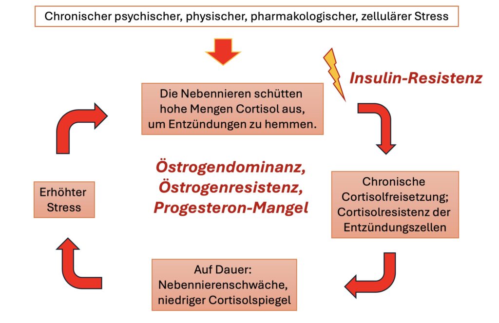 Chronischer Stress und Stoffwechsel-Stress führen zu Insulinresistenz und Östrogendominanz; diese verstärken sich gegenseitig und resultieren in niedrigen Cortisolspiegeln sowie Nebennierenerschöpfung, was den Stress und die Symptome weiter anheizt.